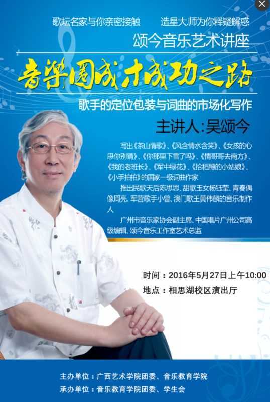 【讲座预告】吴颂今老师音乐艺术讲座——“歌手的定位包装与与词曲的市场化写作” 来源:williamhill威廉希尔 作者: 发布时间:2016-05-25 00:00:00 浏览次数: 次 【字体:小 大】 吴颂今老师音乐艺术讲座——“歌手的定位包装与与词曲的市场化写作” 时间:2016年5月27(周五)上午10:00 地点:williamhill威廉希尔官网相思湖校区演出厅 欢迎您的光临! 分享到: 【打印正文】