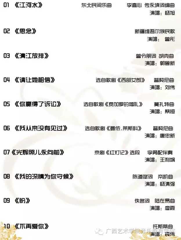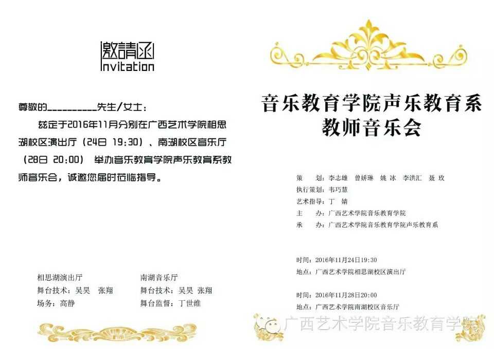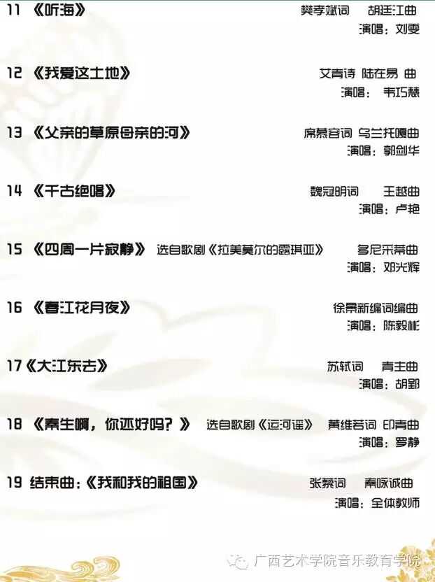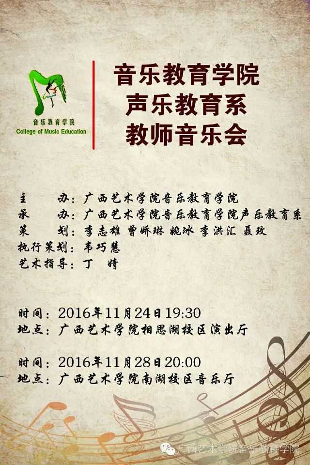 【演艺信息】williamhill威廉希尔声乐教育系教师音乐会 来源:williamhill威廉希尔 作者:williamhill威廉希尔 发布时间:2016-11-23 13:03:31 浏览次数: 次 【字体:小 大】 这是一场声乐教师的展示会, 更是一场精彩的艺术盛宴! 时间:2016年11月24日19:30 地点: williamhill威廉希尔官网相思湖校区演出厅 时间:2016年11月28日20:00 地点: williamhill威廉希尔官网南湖校区音乐厅 分享到: 【打印正文】