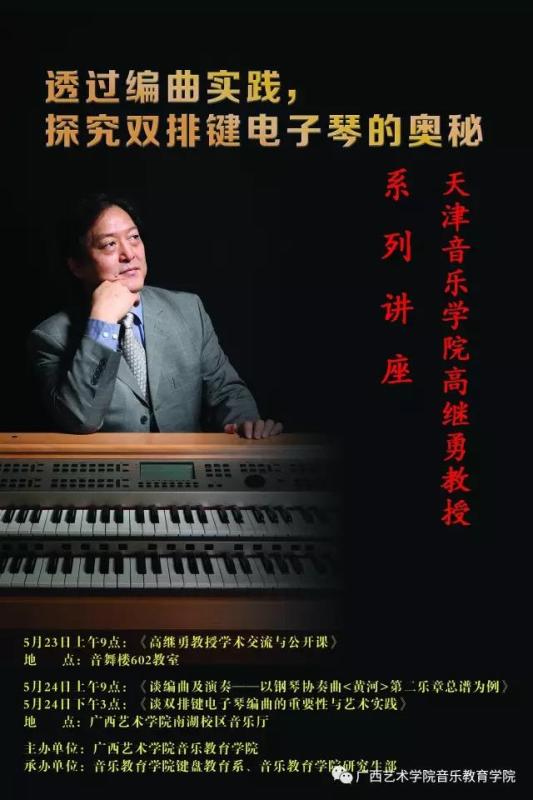 三、5月24日15:00—18:00,讲座题目《谈双排键电子琴编曲的重要性与艺术实践》,地点:williamhill威廉希尔官网南湖校区音乐厅。