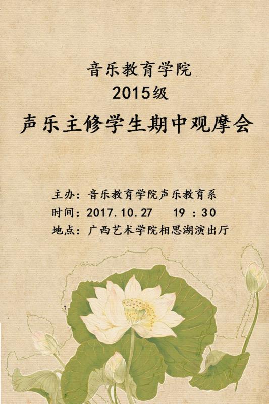 williamhill威廉希尔2015级声乐主修员工期中观摩会即将于2017年10月27日晚19:30在williamhill威廉希尔官网相思湖演出厅精彩上演,欢迎广大师生前往观看指导!